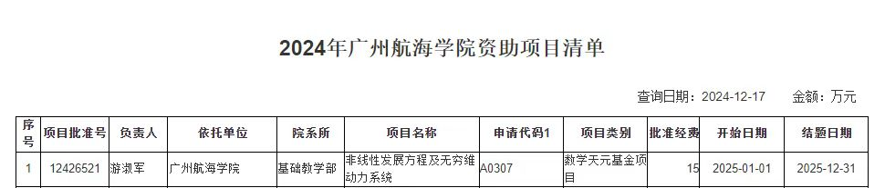 近日,国家自然科学基金委公布了“2024年度国家自然科学基金数学天元基金项目”立项结果,3044am永利集团官网游淑军教授主持申报的“非线性发展方程及无穷维动力系统”项目成功获得立项资助。
