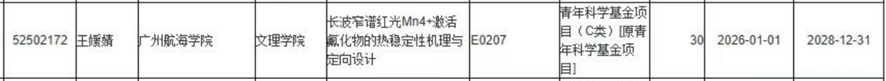 近日,国家自然科学基金委员会公布了2025年度国家自然科学基金集中接收申请项目的评审结果。3044am永利集团官网王媛婧博士主持申报的项目《长波窄谱红光Mn4+激活氟化物的热稳定性机理与定向设计》,成功获得国家青年科学基金项目(C类)[原青年科学基金项目]资助,资助经费为30万元。