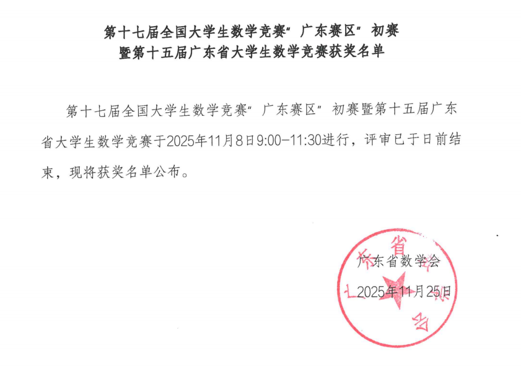 近日,由中国数学会组织、广东数学会与广东工业大学承办的2025年第十七届全国大学生数学竞赛初赛(广东赛区)结果揭晓,我校共有74名学生参加非数学A类组的比赛,共有24名学生斩获佳绩。其中,机械工程专业庄高荣等4位同学获省级一等奖,通信工程专业范文杰等5位同学获省级二等奖,航海技术专业葛俊羿等15位同学获省级三等奖。