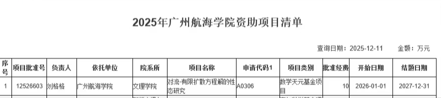 近日,国家自然科学基金委员会公布2025年度数学天元基金项目评审结果。我院刘格格博士申报的《对流–有限扩散方程解的性态研究》天元数学青年项目(批准号:12526603,经费:10万)成功获得立项资助。